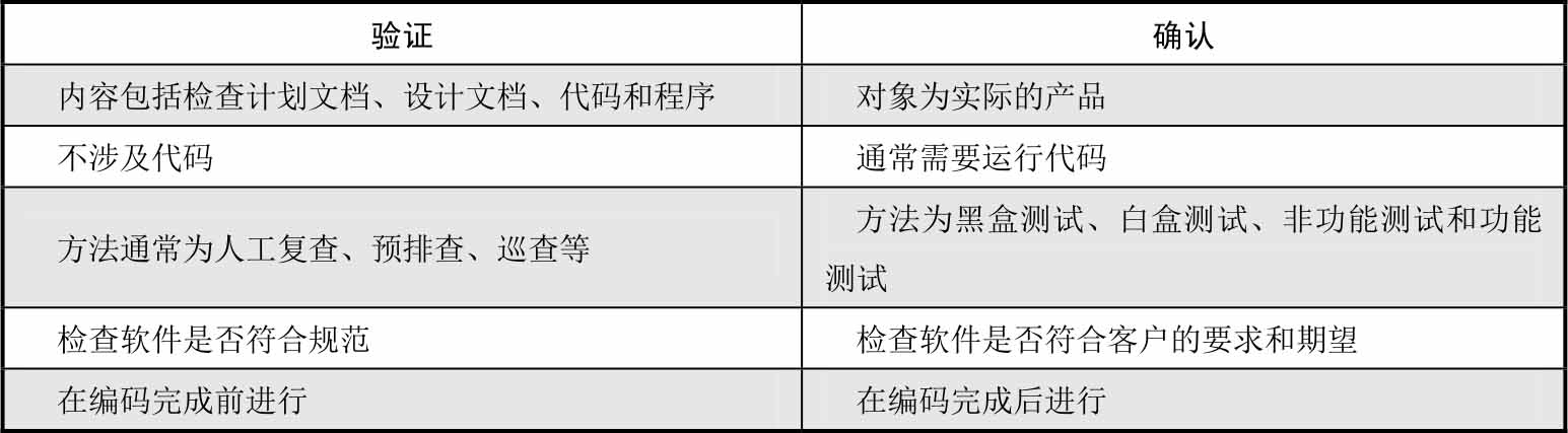 验证(Verification)与确认(Validation)是两个完全不一样的动作,二者的区别如表2-3所示。