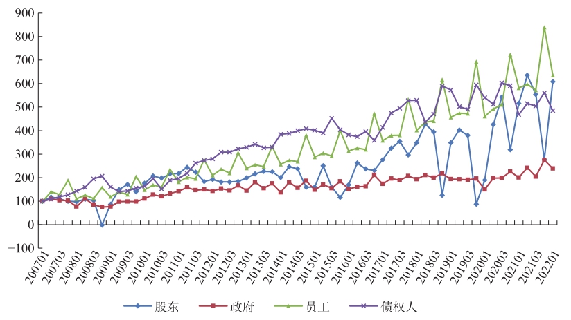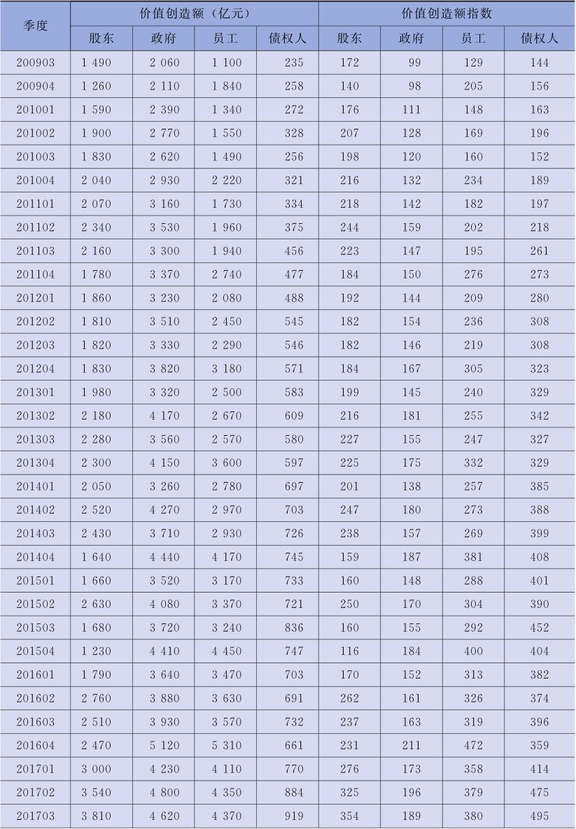 我们对大制造业四类分配主体所获得的价值创造额进行了指数化处理,得到四类大制造业价值创造额指数:大制造业股东获利指数、大制造业政府税收指数、大制造业员工薪酬指数和大制造业债权人利息指数。表3-2和图3-2描述了大制造业四类分配主体价值创造额指数及其变化趋势。
