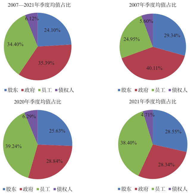 从图3-4中我们可以看到,2020年使用财务费用度量债权人利息所得后债权人利息所得占比为6.29%,同期使用利息费用度量债权人利息所得后债权人利息所得占比为7.33%;2021年使用财务费用度量债权人利息所得后债权人利息所得占比为4.71%,同期使用利息费用度量债权人利息所得后债权人利息所得占比为6.23%。由此可以看出,在使用利息费用度量债权人利息所得后债权人利息所得占比有所提升,其他三类主体所得占比也呈现一定程度的下降。