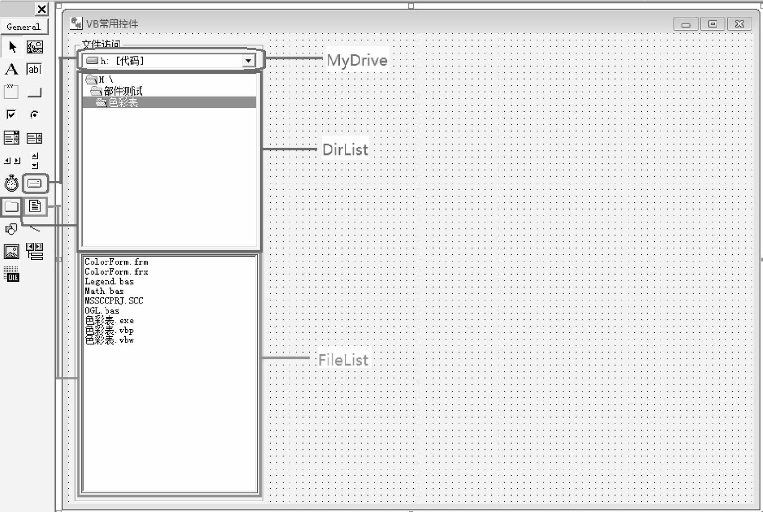 在日常工作中,需要对文件进行频繁操作,如果在开发的软件中增加磁盘文件列表功能将大幅提高操作效率。磁盘文件列表不是单一的一个控件,其集成了磁盘(DriveListBox)、目录(DirListBox)、文件列表(FileListBox),分别命名为MyDrive、DirList、FileList,如图2-1所示。