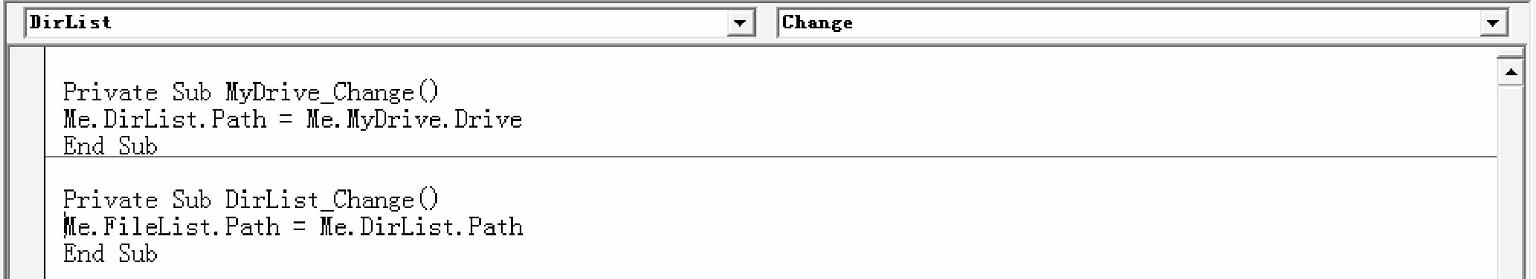 Private Sub MyDrive_Change() Me.DirList.Path = Me.MyDrive.Drive End Sub Private Sub DirList_Change() Me.FileList.Path = Me.DirList.Path End Sub