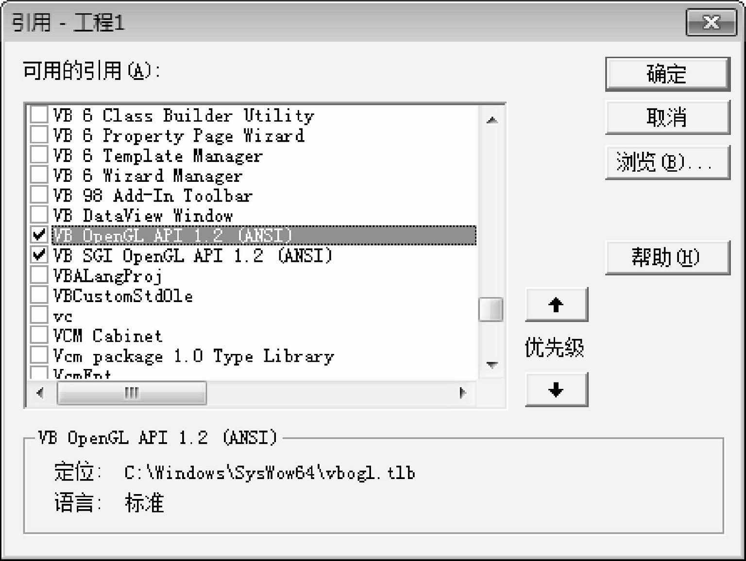 OpenGL的第三方免费库Vbogl.TLB,是在VB开发环境下使用的。要想使用这个库,首先需要在该工程中添加引用,如图3-1所示。