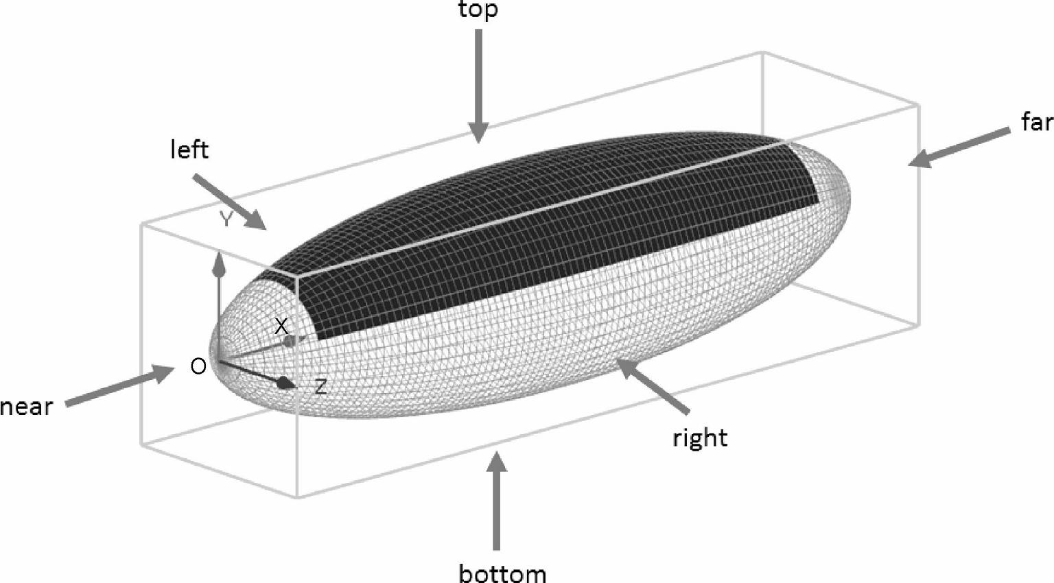 在第3章中,用到了GLU.gluOrtho2D来定义二维显示。在三维显示中需要用到投影的概念。对于计算机屏幕来说,三维物体实际还是以二维平面的形式在显示,因此需要对三维物体进行二维投影变换。变换的方式有透视投影和正投影两种。透视投影与日常生活中看物体一样,同样大小的物体,近处看,大一些;远处看,小一些。而正投影则没有这样的效果,物体的远近显示都一样。在计算机辅助设计软件开发中,我们不希望视景的远近对物体尺寸、角度等产生显示偏差,因此往往会采用正投影的方式。正投影的创建函数是GL.glOrtho(GLdouble left, GLdouble right, GLdouble bottom, GLdouble top, GLdouble near, GLdouble far)。图4-1为程序运行案例,投影后的视景并没有随着位置的远近而发生变化。GL.glOrtho函数的参数如图4-1所示。