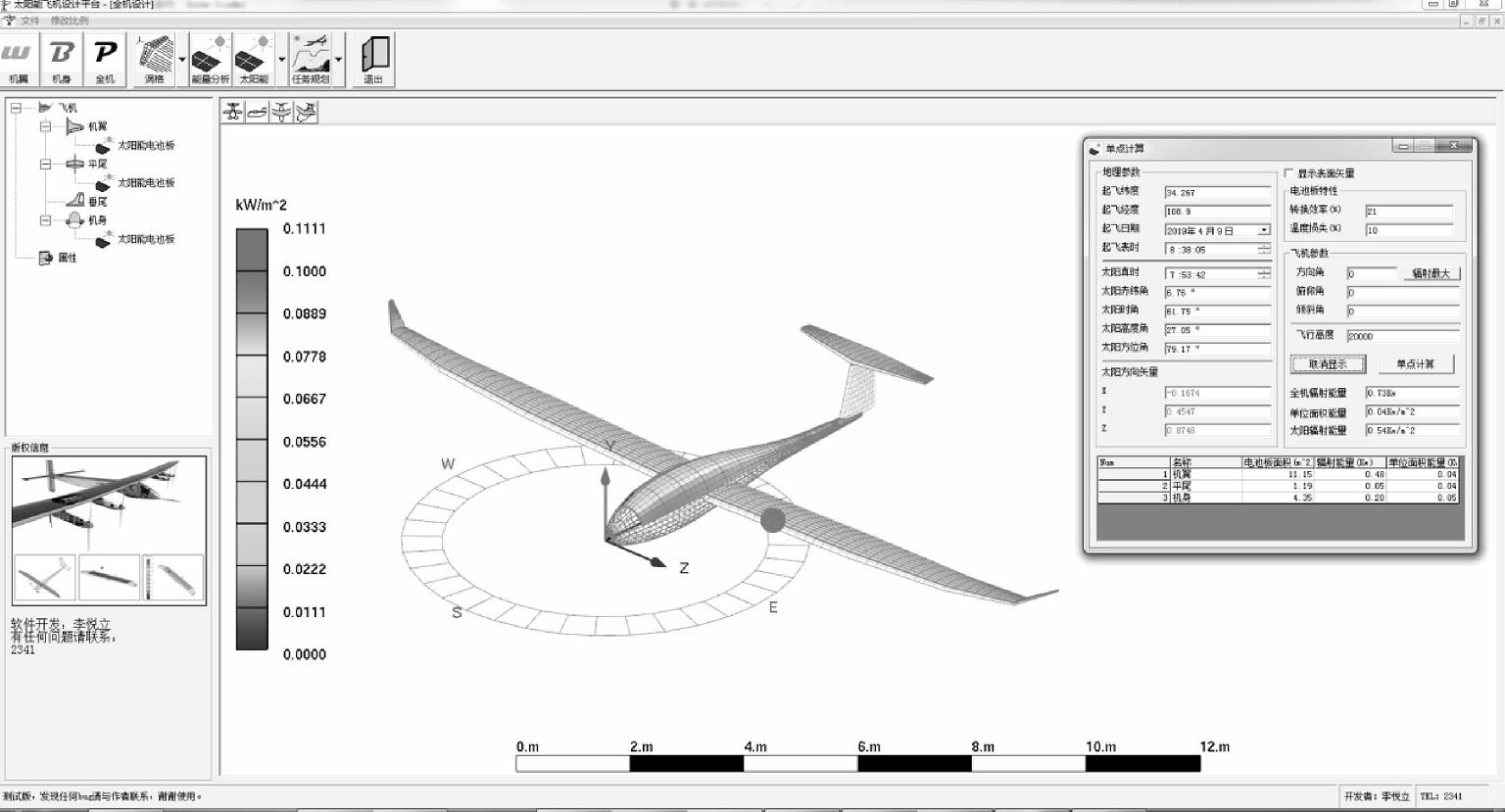 该项目首先确定使用完全的太阳辐射能量理论,包含了地球轨道影响(日期因素)、大气衰减影响(高度因素)、地理纬度影响(太阳高度角)、地理经度影响(太阳真时)、时间影响、物面曲率影响等因素。其次,将全套公式编写为求解函数模块,实现了不同计算条件下统一的函数模块的调用,既提高了编程效率,又提高了程序的鲁棒性与稳定性。再次,根据项目需求,平台设计了4个分析流程:①蓄电池质量分析,对无人机本体的总体参数进行计算分析,判断这些参数是否支持无人机实现跨昼夜飞行;②太阳辐射特性,用于选择合适的飞行日期;③单点计算,用于选择合适的太阳能电池板铺设位置、面积,同时根据飞行日期选择合适的飞行方位;④全天计算,用于全天飞行的太阳辐射能量计算。最后,使用三维显示与操作技术,按照工业软件的开发要求,实现了全鼠标操作,具有飞行器建模、面板铺设、姿态显示、方位显示、计算结果显示、图像保存、项目保存等功能。项目开发的软件平台如图0-9所示。