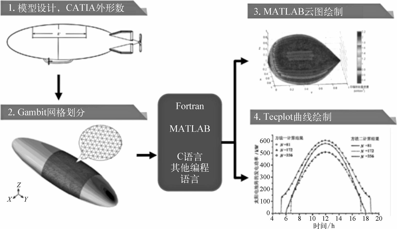 在项目实施期间,国内还没有一款面向飞机设计领域的太阳辐射能量计算分析工业级软件平台。在理论层面,太阳辐射能量求解是一个成熟的算法,由于国内公开的其他项目都是针对飞艇类 [9 - 10] ,对太阳能需求不如飞机来得严苛,这样就造成了两个局面:一个是计算条件简单,只需要在固定高度、固定方位下开展计算;另一个是计算容许误差可以很大,毕竟飞艇的体积很大,在不考虑成本因素下,太阳能电池板可以铺设得很大,能源富余量大,对精细计算的需求并不迫切。国内就与太阳能无人机相关的项目计算做了大量简化,包括大气衰减 [11] 、表面曲率 [12] 、北京时间与当地太阳真时的差异等。在工业软件层面,国内公开的计算软件没有一个是按照工业软件的思想进行设计的,计算基本采用MATLAB或者是Fortran(见图0-8) [9 - 10] ,将涉及曲面矢量求解过程、大气衰减求解过程、时间修正过程进行简化。