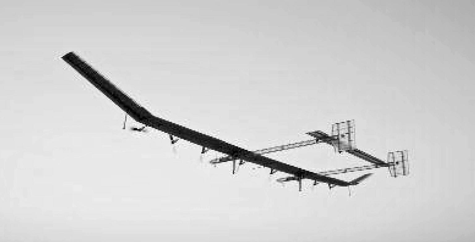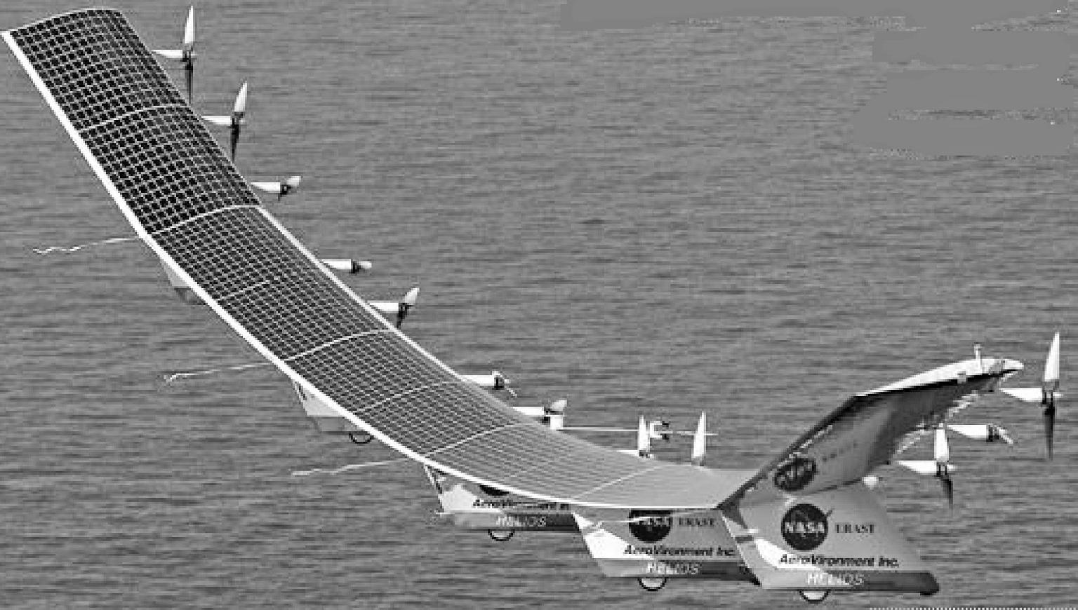 第二阶段为技术发展阶段,验证太阳能作为飞行器主要能源的可行性,能够完全依靠太阳能进行巡航飞行。在概念可行性获得验证后,美国航空环境公司发展的“探路者+”和“太阳神”太阳能无人机基本实现了完全依靠太阳能进行巡航飞行,这两架飞机分别于1998年、1999年首飞。由于超大展弦比柔性飞翼布局机体的一系列技术问题,“太阳神”太阳能无人机(见图0-2)于2003年在试飞中解体坠毁。