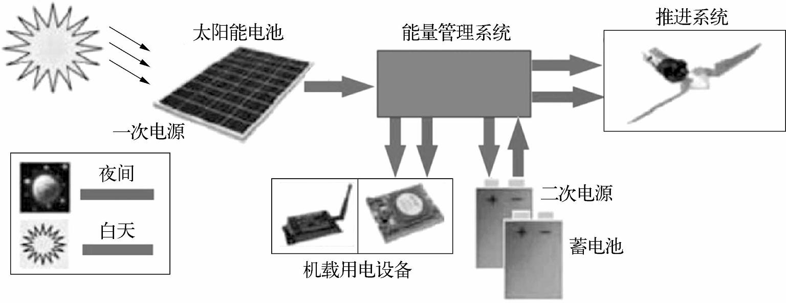 太阳能无人机要实现跨昼夜持续飞行,必须先实现能量供需平衡。当太阳能无人机在白天飞行时,铺设在无人机表面的太阳能电池通过光电转换将太阳辐射的光能转换为电能,部分电能通过电动机驱动螺旋桨为无人机提供飞行动力,另有部分电能满足机载设备和任务载荷的用电需求,还要有剩余电能为蓄电池充电。当其在夜间飞行时,蓄电池释放白天储存的电能,为无人机正常飞行和机载用电设备正常工作提供能量。只要蓄电池储存的电能可维持无人机飞行至重新获得充足的太阳辐射,太阳能无人机就可以实现持续不断的滞空飞行。在太阳能无人机飞行过程中,太阳能电池、蓄电池、电动机和机载设备的用电特性由能量管理系统进行统一管理,其整个能量流动原理如图0-1所示 [1] 。
