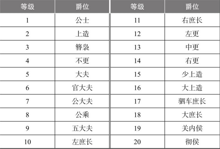 中国历史上著名的“商鞅变法”中有一个关键内容是“军功爵制”,这个机制使秦国的军队所向披靡,军功爵制将士兵的爵位分为20个级别(见表0-1)。
