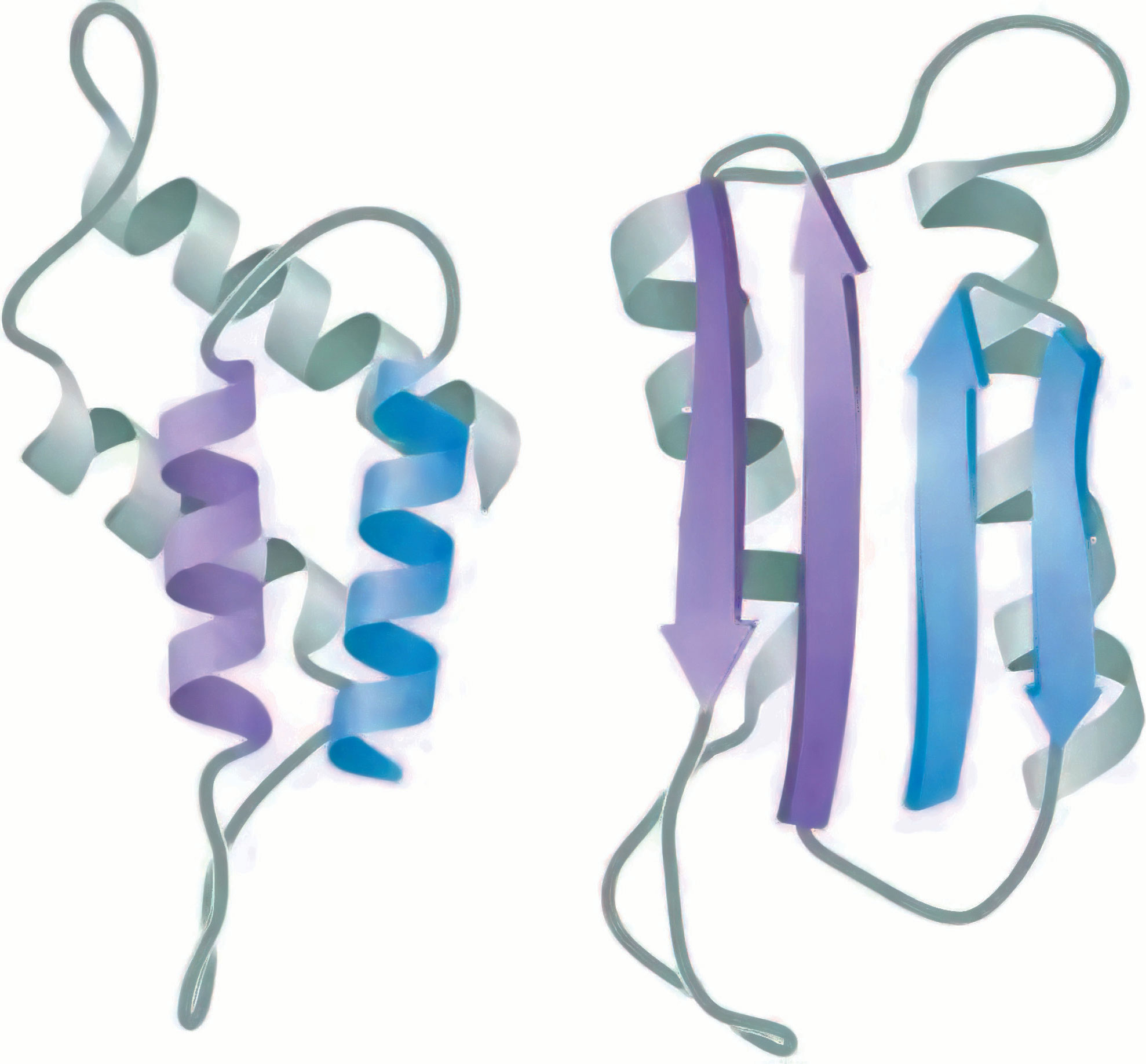 朊病毒蛋白质的三级结构有两种构象:一种是正常的PrPc构象,以α-螺旋为主;另一种是致病的PrPSc构象,以β-折叠为主(图2-17)。富含α-螺旋的PrPc在某种未知蛋白质的作用下,可转变成分子中大多数为β折叠的PrPSc。PrPc和PrPSc的一级结构完全相同,可见PrPc转变成PrPSc涉及蛋白质分子α-螺旋重新折叠成β-折叠的过程。PrPSc对蛋白酶不敏感,水溶性差,对热稳定,可以相互聚集,最终形成淀粉样纤维沉淀而致病。