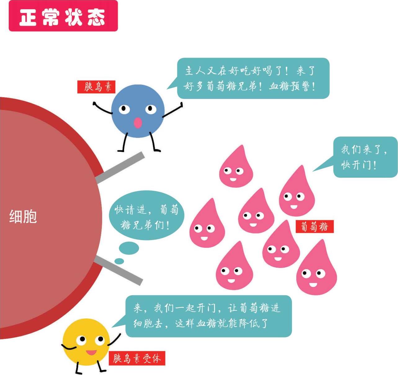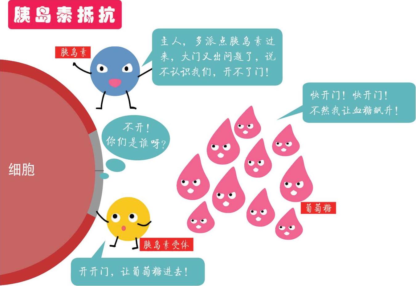 正常状态下,当我们吃了米、面、糖等富含糖类的食物时,血液中的葡萄糖迅速增加。人体胰腺中的β细胞感知到血糖升高后,迅速分泌胰岛素释放到血液中;胰岛素再与胰岛素受体结合,打开葡萄糖通道,使葡萄糖进入细胞。这样血液中多余的葡萄糖就能进入细胞内,供细胞使用或储存起来。当发生胰岛素抵抗时,胰腺感知到血中的葡萄糖水平居高不下时,会分泌更多的胰岛素到一线降糖,导致血液中的胰岛素维持在较高水平。