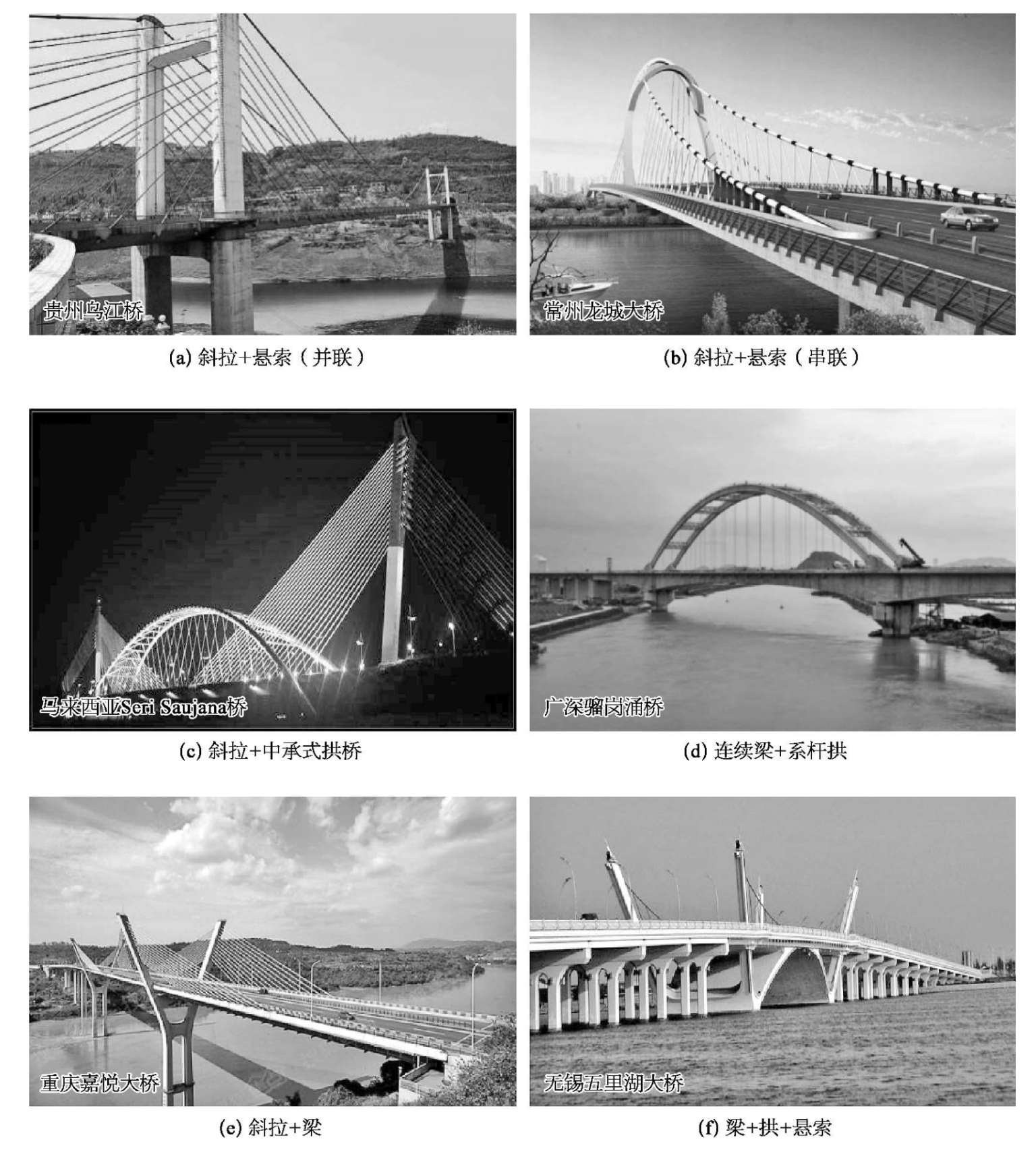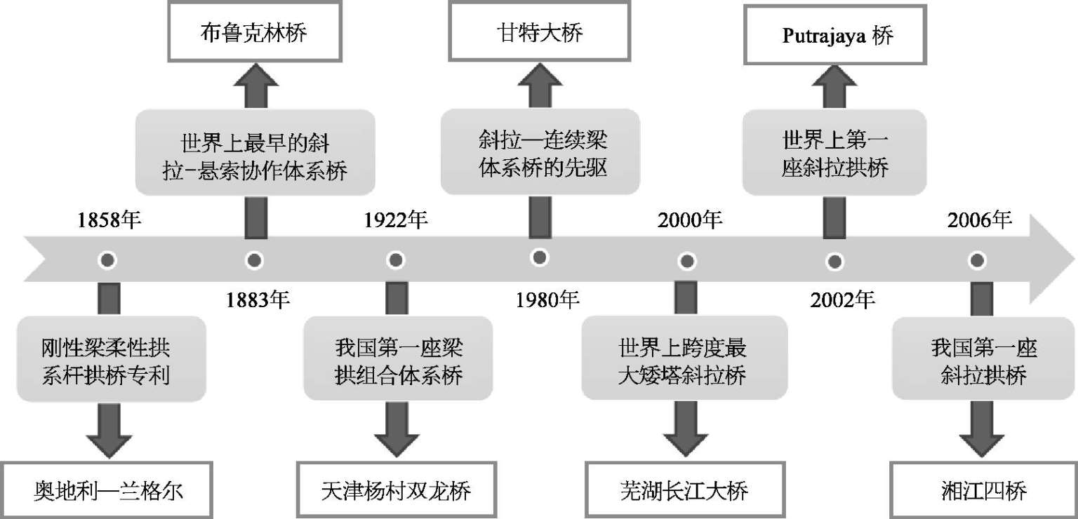 对前述四种基本桥型进行组合,构成共同的支撑体系,就形成了各类组合桥型(见图1-63)。其中,较为典型的有梁—拱体系(很多刚性系梁的系杆拱桥,当系梁刚度很大或拱刚度较低时,都可以认为是拱梁组合体系)、斜拉—悬索体系(并联方式:斜拉和悬索同时支撑同一跨,如贵州乌江大桥;串联方式:斜拉和悬索支撑不同跨,如常州龙城大桥)、斜拉—梁体系(矮塔斜拉桥,如重庆嘉悦大桥)、斜拉—拱体系(如马来西亚Seri Saujana桥)、梁—拱—悬索体系(如无锡五里湖大桥)等组合结构桥型的产生与发展,进一步发挥了各类桥型的优点,使桥梁结构设计、施工、维修更趋合理,并具有全寿命经济性。组合桥型发展历程如图1-64所示。