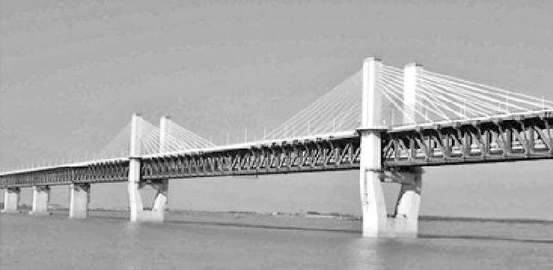 普遍认为,由Christian Menn设计的建于1980年的甘特(Ganter)大桥,是斜拉—连续梁(刚构)体系桥的先驱,其混凝土箱型梁由预应力混凝土斜拉板“悬挂”在非常矮的塔上,形成了斜拉桥的一个分支——板拉桥。1988年法国工程师Jacgues Mathivat在设计位于法国西南的阿勒特·达雷(Arre't Darre)高架桥的替代方案时,首次明确提出矮塔斜拉桥的概念。1990年,德国的Antonie Naaman提出了一种组合体外预应力索桥,体外索的一部分伸出主梁之上,锚固在墩顶处主梁上的钢柱上。这种体系与法国Jacgues Mathivat的方案十分类似。日本1994年建成了第一座真正意义上的矮塔斜拉桥——小田原港(Odawara Blueway)桥(见图1-67),跨度为(74+122+74)m,桥面宽13.0 m,双塔双索面,塔、梁、墩固结,拉索通过塔顶的鞍座后锚固在主梁上。其后这种桥在日本得到迅速发展,先后建成了屋代南北铁路桥、冲原桥、蟹泽大桥、新唐柜大桥等。除此之外,菲律宾于1999年建成了第二曼达麦克坦大桥,主跨为185 m,桥面宽21 m;老挝也于2000年建成了巴色桥,跨度为143 m,桥面宽11.8 m。美国于2006年在珍珠港建成一座矮塔斜拉桥,主桥全长308.7 m,主跨157.0 m。我国矮塔斜拉桥起步较晚,但一开始就令人瞩目。2000年建成的芜湖长江大桥(见图1-68)是一座公铁两用的钢桁梁矮塔斜拉桥,主桥为(180+312+180)m,是目前为止世界上跨度最大的矮塔斜拉桥,也是世界上首次采用钢桁梁作主梁。2001年建成的福建漳州战备大桥,主梁为预应力混凝土箱梁,孔跨径布置为(80.8+132+80.8)m。此后,矮塔斜拉桥在国内发展很快,厦门同安银湖大桥、兰州小西湖黄河大桥等相继建成,标志着国内矮塔斜拉桥技术已日臻完善。