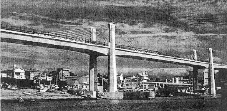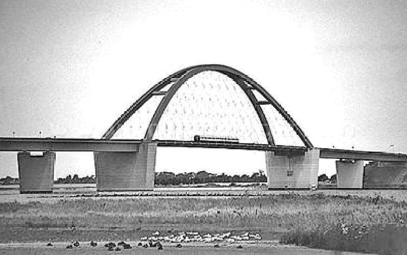 组合体系拱桥的概念最早出现在欧洲。1858年,奥地利人兰格尔(Josef Langer)获得了刚性梁柔性拱的系杆拱桥专利。19世纪末,德国易北河上建造了一座跨度为96.35 m的10跨透镜形弦杆铁路桥,成为所谓洛泽桥(Lohse Trager)的先驱。尼尔森(O.F.Nielson)最早提出采用斜吊杆代替竖直吊杆的设想,以大幅度提高结构刚度,并于1929年在瑞典获得专利。第二次世界大战后,电子计算机问世,钢筋混凝土技术趋于成熟。各国都先后展开了组合体系拱桥方面的研究,梁拱组合体系桥才得以进入高速发展期,建成了德国的费马恩松德(Fehirnarmsund)桥(见图1-65)、美国的弗里蒙特(Fremont)桥(跨度达到382.6 m)、日本的新滨寺桥等。