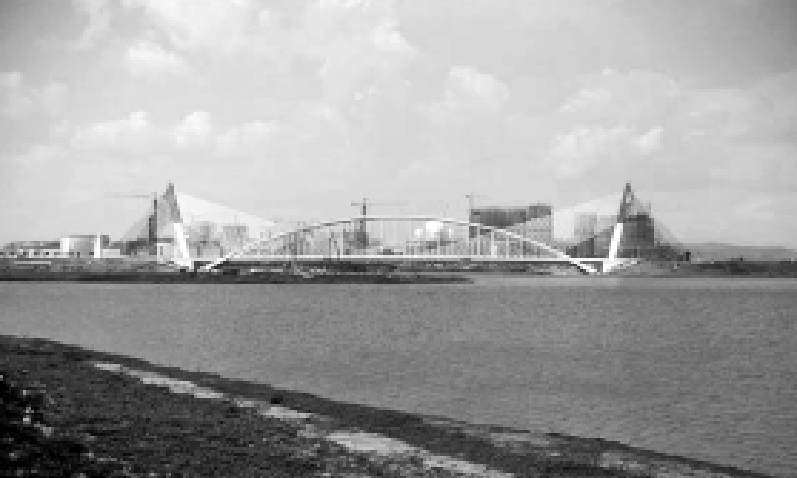 目前,世界上已建成的第一座斜拉拱即2002年马来西亚吉隆坡普特拉贾亚城修建的跨径300 m中承式斜拉拱组合桥(Putrajaya桥,见图1-69)。我国于2006年建成第一座斜拉拱桥——湖南省湘江四桥主桥(见图1-70)。该斜拉拱桥为120 m+400 m+120 m斜拉飞燕式钢管混凝土拱桥,是组合桥梁结构形式的又一次尝试。它将现代的斜拉桥和古典的拱桥有机地结合在一起,与马来西亚的Putrajaya桥的不同之处主要在于,它将斜拉索直接扣于拱肋上面,而不是系在桥面上。