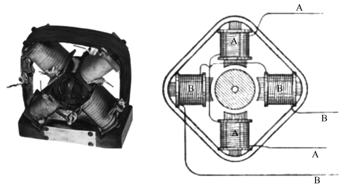 在1885年早些时候,法拉利从麦克斯韦的电磁波理论中得到制作两相电动机和发电机的灵感:将两个交流磁场叠加可以获得旋转磁场,产生与旋转的永磁体相同的效应。具体就是,在两个中心轴正交的相同线圈中通以相同幅度、相同角频率、相差90°的两个正弦电流,那么以角频率旋转的磁场就会在线圈的中心点产生,磁场的旋转频率与静止电路中注入的电流频率是一致的。当然,如果电流和线圈都是相差120°,结果同样适用于三个线圈。他在1885年8~9月制作了这样的两相电动机,如图1-14所示。