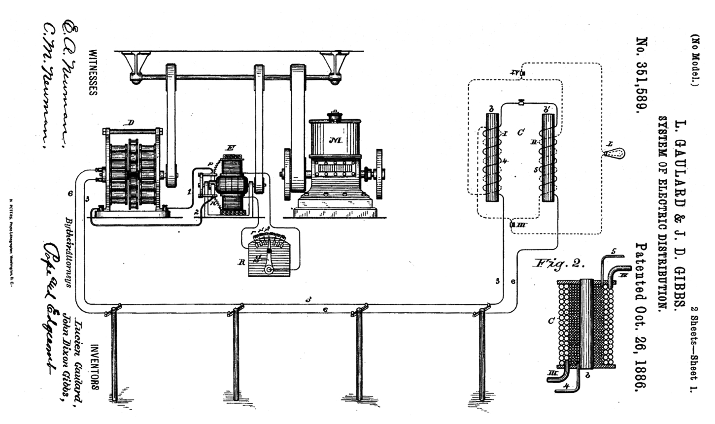 1884年,特斯拉一来到纽约就为爱迪生打工,工作几年之后他们分道扬镳,主要是爱迪生支持生产和传输直流电,而特斯拉站在生产和传输交流电一方。特斯拉从爱迪生公司出来后建立了自己的特斯拉电气公司,取得了交流电的许多专利。乔治·西屋对交流输电系统非常感兴趣,于1888年支付给特斯拉约17万美元购买交流发电机和电动机专利,以及以后公司售出电机还需支付2.5美元每马力专利税。当然,乔治·西屋还买下了高拉德和吉布斯两人的“交流配电”专利(Apparatus for the production and utilization of secondary electric currents,US0297924;System of electric distribution,US0351589),如图1-16所示,并对他俩创造的开磁路式变压器结构进行革新,研制了具有现代实用性的电力变压器(见第3章3.1节)。