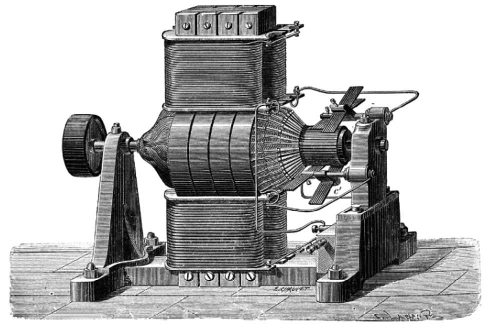 1870年在法国工作的比利时人格兰姆(Gramme)试制成线圈绕成环形电枢的格兰姆自激直流发电机,并于1875年进一步改成速度较高、质量较轻、使用价值较大的直流发电机,安装在巴黎北火车站发电厂,为车站附近弧光灯提供电源,这是世界上第一座火力发电厂。在1881年巴黎电气展览会上,展出了爱迪生制造的当时容量最大的直流发电机,功率150马力