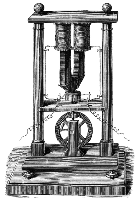 电磁感应发现之后很快被机械设计师们所应用,从那时起,各类电磁能量转换装置以及相关电力电路得到了迅速发展。在法拉第电磁感应实验的启示下,1832年,法国工程师皮克西(Hippolyte Pixii)制造了自己的发电机,如图1-12所示。他的机器是手动的,在固定的铁心绕上导线线圈,线圈下有旋转的U形磁铁(通过手轮和齿轮使其旋转),磁铁旋转时在线圈导线中就产生了电流,皮克西的发电机产生交流电,这在当时没什么意义[由于最初的伏特电堆产生的是直流电,所以人们认为发电机就应该产生直流电,从某种意义上说,在交流发电机上加装整流装置来输出直流电,这个想法使电气工程工业的发展推迟了大约60年,即从1831年法拉第实验到1891年的劳芬(Lauffen)实验,直到那时起人们才决定用交流电来进行远距离传输。]。于是在安培的建议下,皮克西安装了一个将交流电转换为脉冲直流电的整流器。皮克西发明的这种发电机在世界上是首创,虽然本质上是一个工作模型,但它是第一个基于法拉第发现的原理制造的实用发电机。可惜皮克西英年早逝,27岁时在一次车祸中去世了。