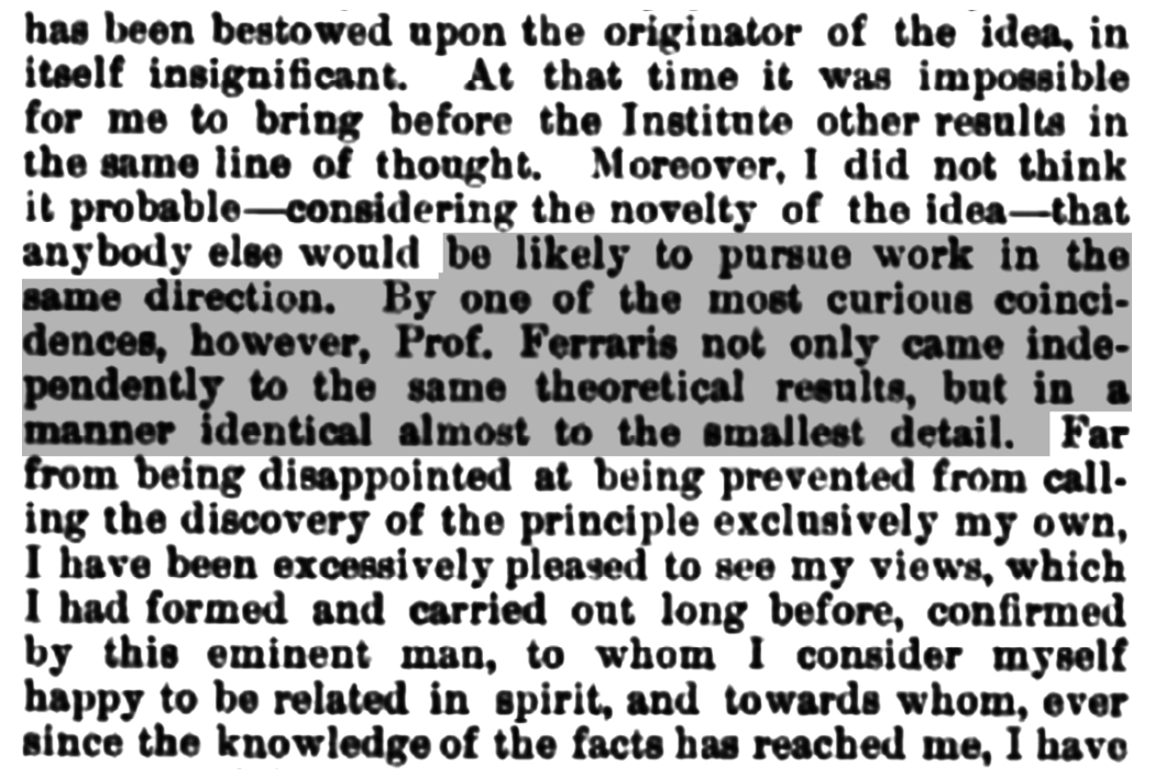 实际上直到1888年法拉利才发表了论文《交流电产生的电动旋转》,讨论在交流发电机中使用多相交流电。不久之后,法拉利知道了特斯拉申请的两相交流发电机和电动机专利刚刚被授权。有人指出特斯拉的电机是基于法拉利教授的“旋转磁场”的思想,特斯拉进行了反驳,声称这纯属巧合,如图1-15所示。