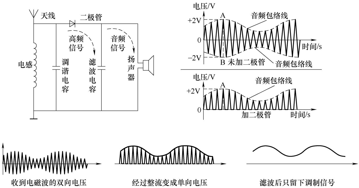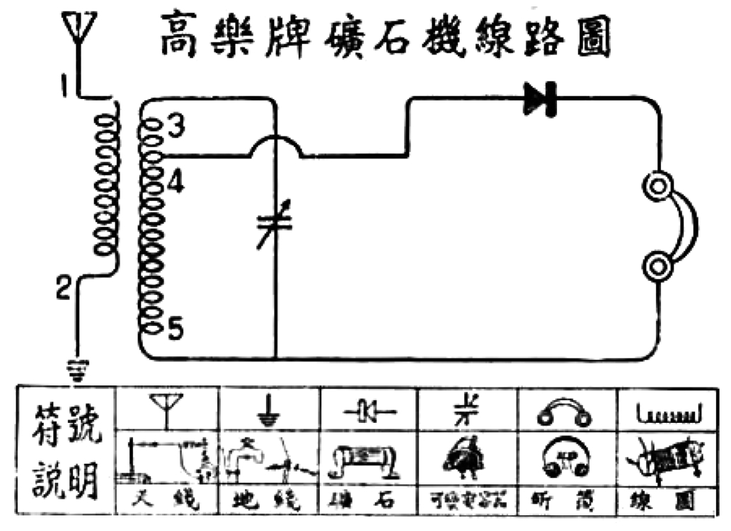 被音频信号调制过的无线电载波是以横轴对称的,即上下各有一条相反的音频包络线。耳机对高频载波的信号没有反应(即使有反应我们的耳朵也听不出来),只对音频包络线有反应。在某时刻,假设与之对应的上包络上A点的电压是+2V,那下面B点的电压就是-2V,刚好与A点相抵消。这幅图上任意时刻都是如此情形,即音频载波反应在耳机上的电压是零,耳机膜片不会振动,当然就不会响。可是在电路里串联一只二极管,情况就不同了。二极管有个单向导电的特性,即它只允许正方向的振荡电流通过,反方向的时候电路相当于断开。即感应电流的下半部分被削去了,只剩下载波和一条音频包络线,这样在不同时刻加在耳机电磁铁上的电压不同,耳机就能发声了。通常再加一个高频电容,它的作用是滤波,电容的特性是通高频、隔低频,用作载波的高频信号直接经滤波电容跑掉了,只剩下音频信号经过耳机发声,这样我们听到的声音会清晰一些,这就是二极管的检波作用。早期的检波器元件是直接用天然矿石做成,使用时得通过一根金属探针调整其在矿石上的压力和方位使其具有单向导电性(也即整流效应),可以用来检波,这也就是国内“矿石收音机”名称的来源。我在网上找到的高乐牌矿石收音机线路如图2-2所示,其中的二极管即采用矿石的整流效应。