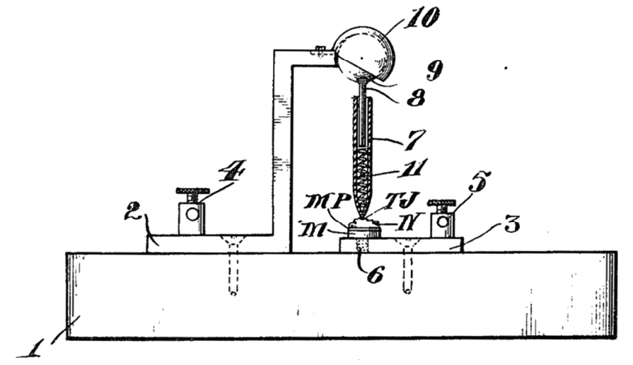 在1902—1906年间,美国电话电报电气工程师皮卡德(G.W.Pickard)测试了数千种矿物样品以评估其整流特性,发现西屋电气公司的硅晶体产生的整流效果最好。1906年他为硅点接触探测器(也即二极管)申请了“用于接收电波通信的装置”(Means for receiving intelligence communicated by electric waves,US836531)的美国专利,并于当年11月20号就获得授权,如图2-4所示。皮卡德与两个合伙人成立了无线特种仪器公司,推销“猫须”晶体无线电探测器,它可能是世界上第一家制造和销售硅半导体器件的公司。