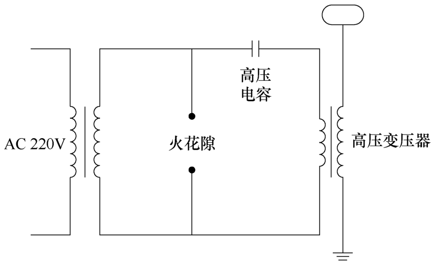 另一位在变压器领域有较大贡献的就是大家熟知的特斯拉,他在1891年发明了能产生高压高频低电流的谐振变压器电路,俗称特斯拉线圈,被广泛应用在X光机、无线电传输等场合。特斯拉线圈的原理如图3-4所示。运行时,高压电源及变压器向一次侧谐振电容器上充电,然后通过火花隙以火花形式放电,放电过程中在一次侧电路中产生振荡脉冲电流,经过谐振变压器的电压放大而传递到二次侧,最后在二次侧形成振荡的高电压。这种原理产生的电压频率通常为较低的射频范围,在50kHz~1MHz左右。