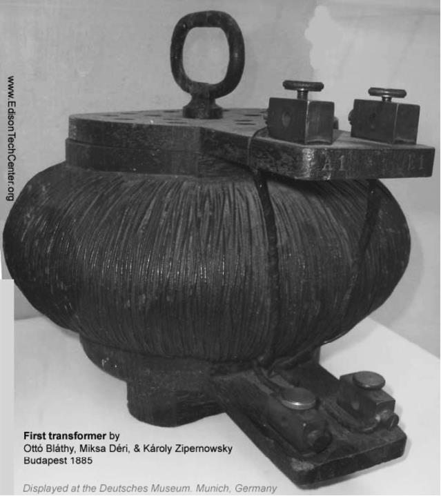 1885年5月1日,在匈牙利布达佩斯国家博览会上,75台岗茨工厂的ZDB变压器通过将一台150V的单相交流电机电压进行降压,点燃了博览会现场的1067只灯泡,展示效果引起了轰动,这一天也标志着现代实用变压器的诞生,三位工程师及岗茨工厂也声名鹊起。布拉什在1885年首先引入单词“Transformer”(美国好莱坞大片“Transformers”在国内译作“变形金刚”),并被沿用至今。此外,三位工程师还发明了铁心叠片结构,通过叠片形式大大降低了铁心的涡流损耗,进一步提升了效率。ZDB变压器的发明是一个重要的里程碑事件,它奠定了现代变压器的基本原形,在此以后,变压器在欧洲迅速推广,1899年突破10000台。由ZDB变压器组构的交流电网推动了交流系统的应用。以上讨论的主要是单相变压器,俄国人多布罗沃利斯基则发明了三相变压器(见第1章)。