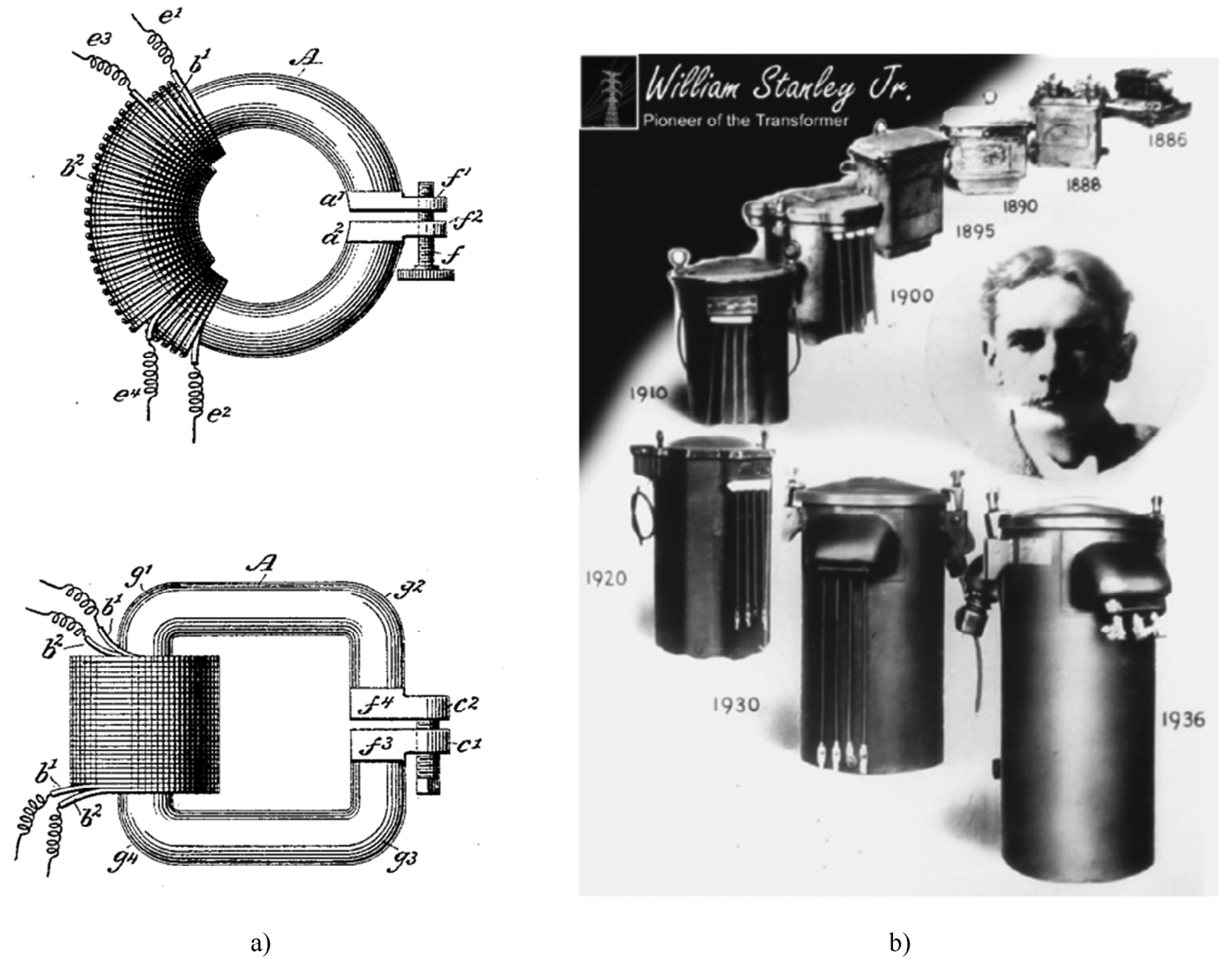 后面对变压器作出重要贡献的是法国人高拉德和英国人吉布斯,他们为变压器找到了一个应用场合,那就是交流输配电系统(见第1章相关内容),他们引入了开路铁心充当磁路部件,大大提升了变压器的功能。他们种下的变压器种子在美国和欧洲都得到了开花结果。花开两朵,各表一枝。先说在美国,西屋电气公司买了高拉德和吉布斯的专利后,公司工程师斯坦利(William Stanley)认识到变压器系统的缺陷——没法自我调节,因为这套系统采用了串联结构。于是在1886年申请了变压器的美国专利“Induction coil,US0349611”,如图3-2a所示,后来斯坦利又不断对变压器进行改进,如图3-2b所示 [3] 。由于斯坦利在交流变压器及交流系统的杰出贡献,他在1912年被授予AIEE(American Institute of Electrical Engineers,即为IEEE前身)爱迪生奖章,以表彰其在发明和发展交流电系统和设备方面的杰出成就。