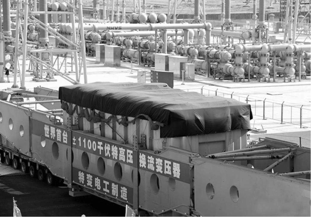 而我国变压器的历史不得不提沈阳变压器有限责任公司,它成立于1938年,是我国变压器行业的发源地,于2003年被特变电工重组。沈变于1951年接受国家制造大型变压器任务,1952年我国第一台自主生产的5000kVA大容量变压器终于下线,被称为“五千号”,这是我国制造的第一台大型变压器。2009年我国首台±800kV特高压换流变压器在特变电工沈阳变压器集团有限公司研制成功。2018年5月26日,世界首台±1100kV特高压换流变压器由特变电工试制成功,单台容量607500kVA,再次刷新了该领域的世界纪录,如图3-6所示。