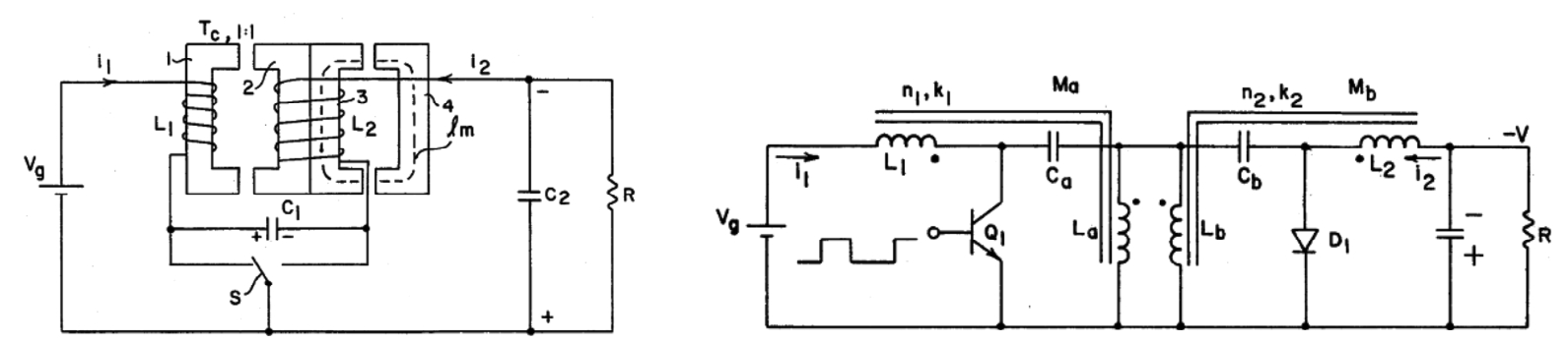 在磁集成早期发展时期做出突出贡献还有美国加州理工学院的R.D.Middlebrook教授和他的学生Slobodan Cuk教授,他们从1980年起申请了一系列相关专利 [55-58] ,旨在提升变换器效率、降低EMI干扰的同时减少使用的元器件数目,在设计得当的电路中,通过磁集成可以使得磁通脉动相互抵消,其电流甚至可以实现“零纹波”。图3-27为他们所提的部分电路,他们提出了一系列各类磁元件集成方法,极大丰富了磁集成设计思路。