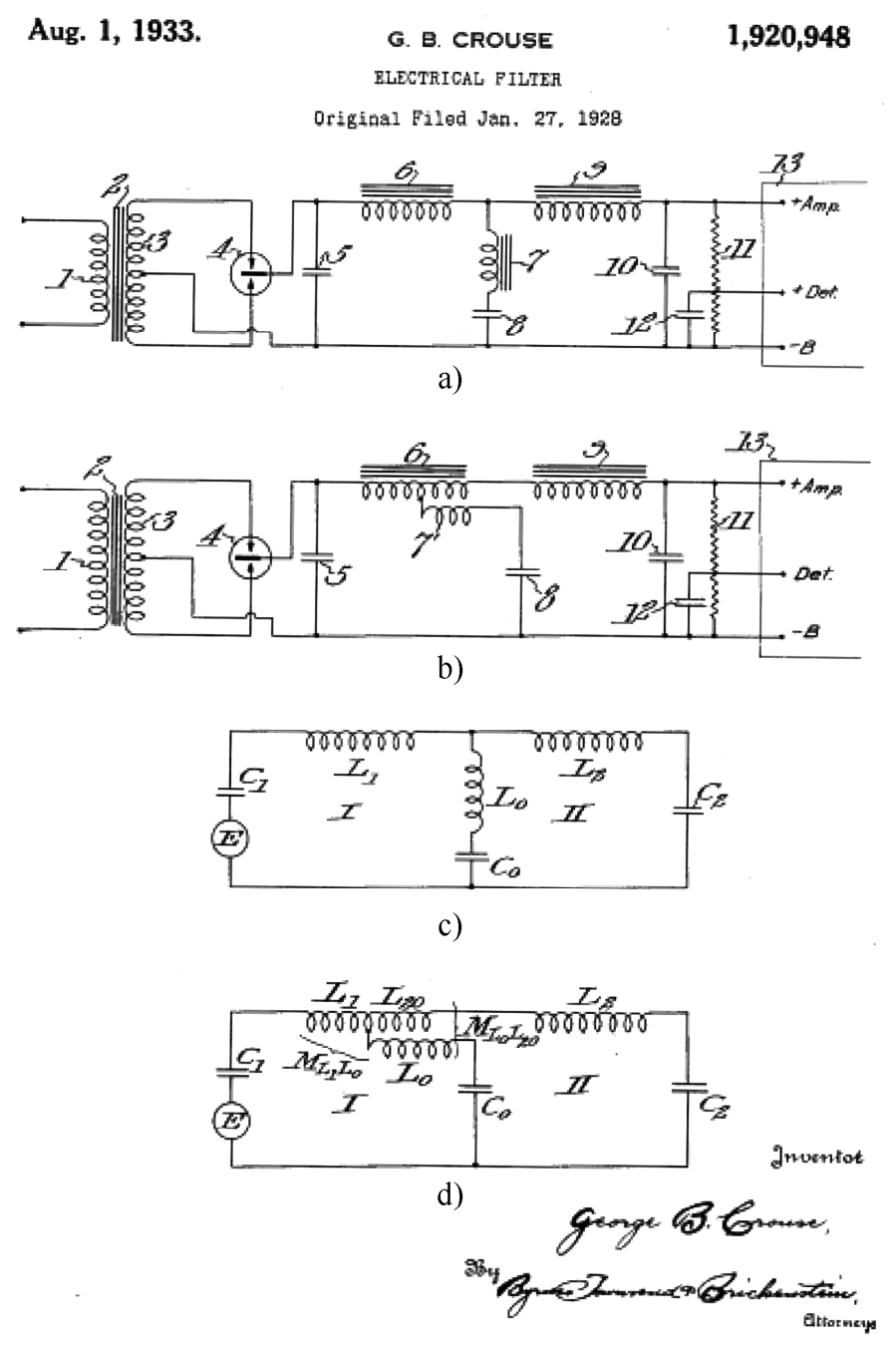 早在1928年G.B.Crouse申请了在无线电路中的滤波器内使用磁集成技术的美国专利“Electrical filter,US1920948”,如图3-24所示。在这个专利中他提出了一个为直流电路滤除交流纹波的结构。其中图a是原始结构,图b是该发明的结构示意图,二者可以达到相似的滤波效果。而图c和图d分别是图a和图b的数学简化和等效。由于去除了原始的电感7,整个系统的体积有所减小。