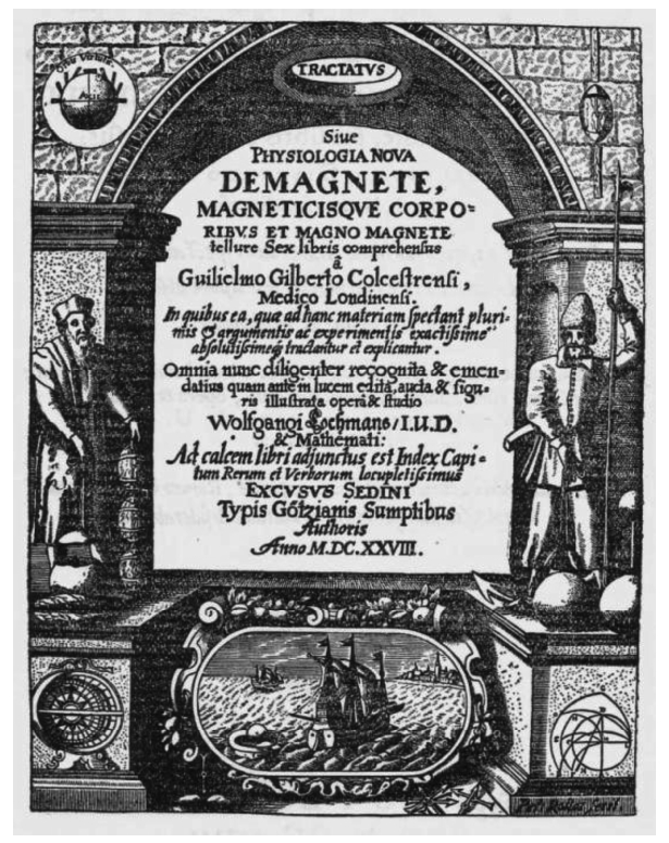 “琥珀”在希腊语中称为“elektron”,1600年,英国的内科医生、自然哲学家威廉·吉尔伯特(William Gilbert)出版了物理学史上第一部系统阐述磁学的开山巨著 DeMagnete (《磁石论》),如图1-3所示。其中用一个拉丁语单词“electricus”来形容某些物体经过摩擦后能够产生吸引力,字面意思就是“像琥珀一样的”。吉尔伯特对静电和磁进行了研究,研制了简单的验电器,用来观测物体对静电的感应,吉尔伯特通过实验对比,将磁现象和静电现象做了比较严格的区分和系统性研究。吉尔伯特是当之无愧的电学和磁学先驱者,为了纪念他,在CGS单位制中,吉尔伯特(Gilbert)用来表示磁通势,简称吉伯,对应MKS单位制中的安匝数[转换关系如下:1Gilbert(吉尔伯特)=0.796A(安培)]。1646年,另一位英国内科医生、作家托马斯·布朗(Thomas Browne)在其著作中有“electricity; that is,a power to attract straws and light bodies”,开始用英语单词“electricity”(电)。从此以后,原本表示“琥珀”的词根electr-,就引申出了“电”的含义,衍生出了大量与“电”有关的单词。