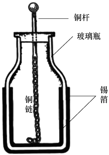 1746年荷兰莱顿大学的物理学家马森布罗克(Pieter van Musschenbroek)偶然发现了电荷存储现象并进行了研究[1745年,德国发明家克莱斯特(Ewald Georg von Kleist)同样独立发现并进行研究],后来称该电荷存储装置为莱顿瓶,典型的莱顿瓶如图1-5所示,是一个玻璃容器,内外包覆着导电金属箔作为极板。瓶口上端接一个球形电极,下端利用导体(通常是金属锁链)与内侧金属箔或是水连接。莱顿瓶的充电方式是将电极接上静电产生器或起电盘等来源,外部金属箔接地,内部与外部的金属将会携带相等但极性相反的电荷。莱顿瓶的发明使物理学第一次有办法得到很多电荷,并对其性质进行研究。刚开始,科学家们以为是封闭的瓶子存储了电荷,后来发现,就算只有两块平板,只要让它们不接触,也能储存电荷,而并不一定要做成像莱顿瓶那样的装置,这就是电容器雏形。