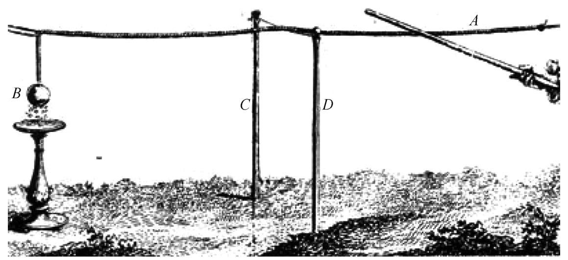 1729年,英国物理学家斯蒂芬·格雷(Stephen Gray)发现电是可以传导的,但能传导多远呢,格雷做了一个实验,用一根黄铜丝连接一个铁球,再用丝绸将黄铜丝包裹起来,成功地把“电流体”传输到了800ft