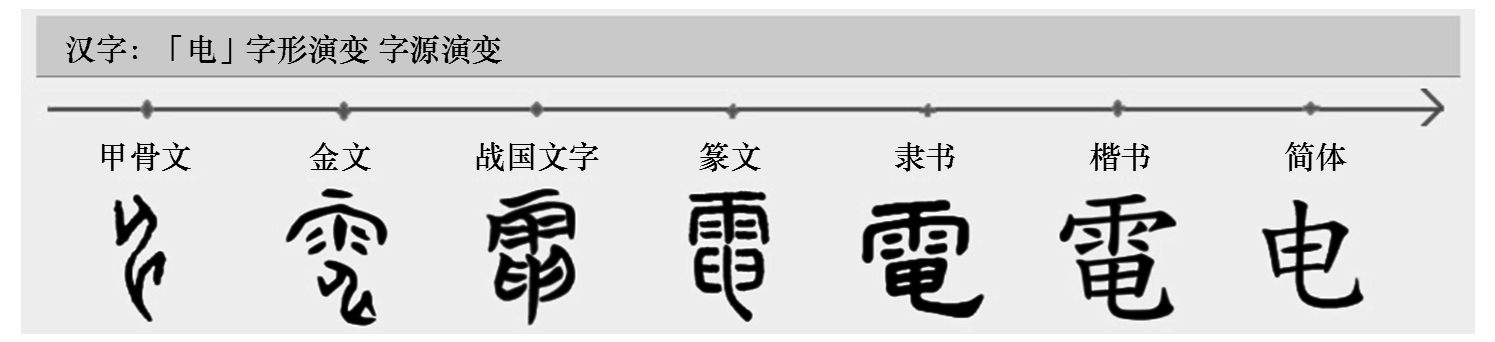 “电”字的整个演变过程,如图1-2所示。到了周朝的“金文”,以及秦朝的“小篆”“隶书”等字体,“电”字就从甲骨文里类似天上闪电向四方伸展的样子变成了繁体字“電”。我国汉字属于表意文字,人们看字形就能大致知道汉字所要表明的意思。这一点在繁体字“電”中也有体现。“電”为上下结构的字,上面是雨字头,底下是电字底,这种字形就表明:“電”(雷电)是和下雨有关的自然现象。所以,通过对“电”(電)字的古代演变的分析和解读,我们就能看出:电在古代的本意就是闪电的意思。殷商时代的《易经》中就有“刚柔分,动而明,雷电合而章”。先秦诗经《小雅·十月之交》中有“烨烨震电,不宁不令。”,记录了公元前780年时陕西岐山大地震的情形,即地震时电光耀眼、噼啪闪烁,大地不停地震动。汉朝许慎《说文解字》中有“电,阴阳激燿也。”,即天空中阴阳能量激合而爆发的耀眼光带。可见,中国古籍中的“电”字都指的是闪电,并逐步用阴阳理论加以解释。