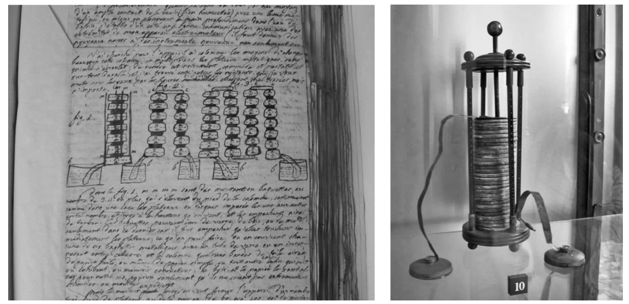 这引起了意大利科学家亚历山德罗·伏特(Alessandro Volta)的兴趣,他做了同样的实验,现象是重复出来了,但伏特提出了自己的理论:蛙腿抽动的电能,不是来自青蛙,而是来自与蛙腿接触的金属,蛙腿发生抽搐只是起到验电器作用。1793年伏特发表一篇论文,总结了自己的实验。后来,伏特通过进一步的实验研究,终于发现两片不同金属不用动物体也可以有电产生,并据此发明了电池。1800年伏特给英国皇家学会会长约瑟夫·班克斯(Joseph Banks)写信报告了他的发明,如图1-7所示,后来这封信发表在《哲学学报》上,题目是《关于不同种类电解质接触而激发的电力》。
