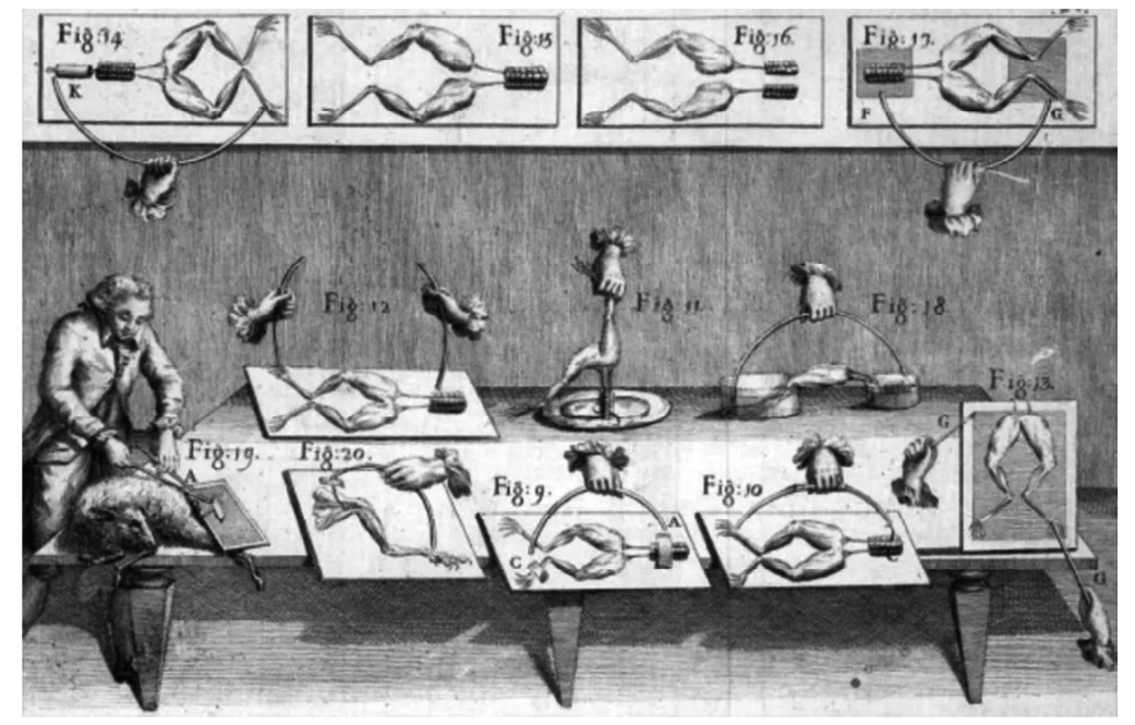 1786年,意大利解剖学家易吉·伽伐尼(Luigi Galvani)在一次偶然的机会中发现,解剖后的青蛙大腿在同时接触到两种不同金属时会抽搐。这就是最原始的伽伐尼“电池”,青蛙是电解质,也是电流指示器。但伽伐尼误认为青蛙肌肉内含有“动物电”,是动物本身所具有的,当两种不同金属与之接触,就把这种“动物电”激发出来了,不明白这只是由于电流经过而引起的抽搐。1791年,伽伐尼用拉丁文发表了题为《论肌肉运动中的电力》的文章,如图1-6所示。