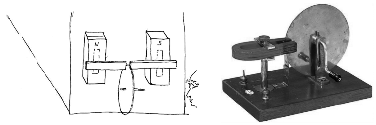 图1-10 法拉第日记中的发电机草图与手摇圆盘直流发电机复原样机