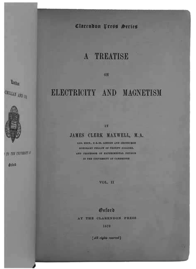 时间差不多该电磁理论的集大成者——英国伟大的科学家麦克斯韦出场了。19世纪50年代,当正在英国剑桥大学的麦克斯韦阅读了法拉第的著作《电学的实验研究》( Experimental Researches in Electricity )之后,被法拉第实验的精确性以及精妙的推理所吸引,开始越来越多地转向电和磁的思考。麦克斯韦有一个重要的天赋,就是擅长类比。麦克斯韦将法拉第想出的“力线”类比为装满了不可压缩流体的“力管”。这力管的方向代表力场(电场或磁场)的方向,力管的截面面积与力管内的流体速度成反比,而这流体速度可以比拟为电场或磁场。借用流体力学的一些数学框架,即可推导出一系列初步成形的电磁学雏论,并于1855年发表了他的第一篇电磁方面的论文《论法拉第力线》( On Faraday ’ s Lines of Force )。正如麦克斯韦后来承认的,他的电磁场数学理论的基本思想就来自法拉第,自己的贡献只不过是给出了经典场方程的数学表达式(这当然是自谦的说法)。在1861年,麦克斯韦发表了《论物理力线》( On Physical Lines of Force ),在这篇论文里,他阐述了可以比拟各种电磁现象的“分子涡流理论”和电势移的概念。麦克斯韦在前进的道路上继续着传奇。1864年,他发表了第三篇电磁方面的论文——《电磁场的动力学理论》( A Dynamical Theory of the Electromagnetic Field )。对这篇论文,麦克斯韦对自己表示很满意,这个最谦虚的人,竟然开始“自吹自擂”起来了,在一封写给他表哥查尔斯·霍普·凯的信的结尾,麦克斯韦写道“我还写了一篇伟大的论文,其中包含了一种关于光的电磁理论,我自信,这是一门巨大的大炮。”1873年,麦克斯韦出版了划时代的近1000页的巨著《电磁通论》( A Treatise on Electricity and Magnetism ),全面阐述了他所建立的经典电磁学理论,在理论上预言了电磁波的存在。麦克斯韦在书中从库仑定律的发现到麦克斯韦方程组的建立做了全面系统的阐述。麦克斯韦完整而深刻地揭示出变化的磁场可以激发电场、变化的电场又能激发磁场这一客观规律,从而使人们认识到交变电场和交变磁场是相互联系、相互转化、组成统一的电磁场。《电磁通论》这部著作的地位足以与牛顿的《自然哲学的数学原理》、达尔文的《物种起源》相比肩,如图1-11所示。