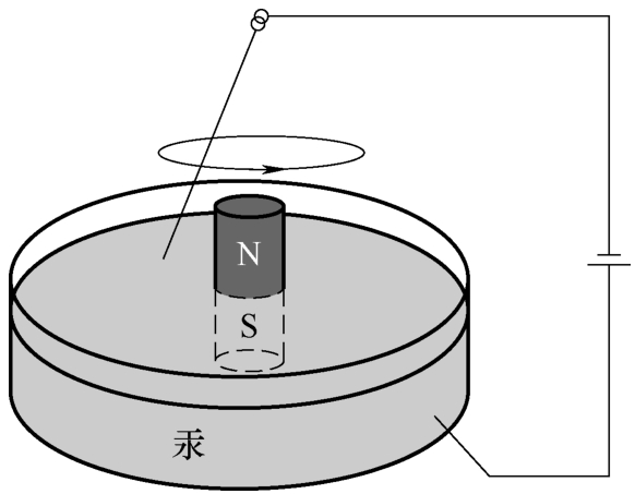 接下来就是法拉第出色地展示了他的实验能力天赋:他将一块铁棒磁铁插入一个盆中的热蜡里,当蜡变硬后再把盆里装满汞,直到仅有磁铁的顶端露出来,他从一个绝缘的支架上悬挂一段很短的电线使它的底部浸在汞中,然后将电池的一端接到电线的顶端,电池的另一端接到汞,电线和汞现在是电路的一部分,即使电线的底部移动,电路也不会被破坏,然后移动电线——它在磁铁周围快速旋转。如图1-8所示。法拉第制造了世界上第一台电动机,这个装置现称为单极电动机。
