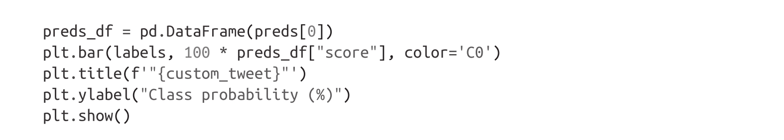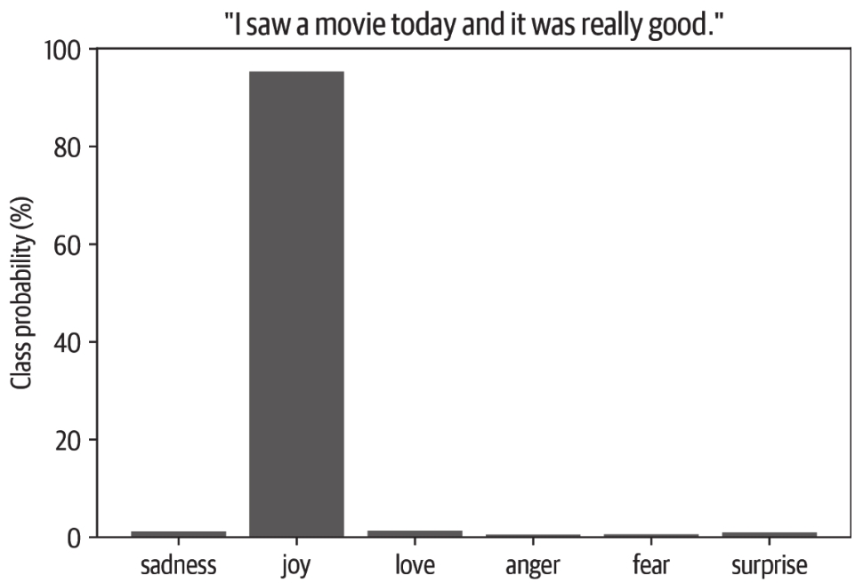 最后,我们可以用条形图绘制每个类别的概率。很明显,模型估计最可能的类是joy,这对于给定的推文似乎是合理的: