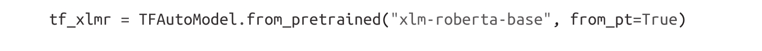 当模型仅在一个框架中发布,而你想在另一个框架中使用时,这种互操作性特别有用。例如,在第4章中我们会遇到XLM-RoBERTa模型( https://oreil.ly/OUMvG ),它只有PyTorch权重,因此如果你尝试像之前一样在TensorFlow中加载它: