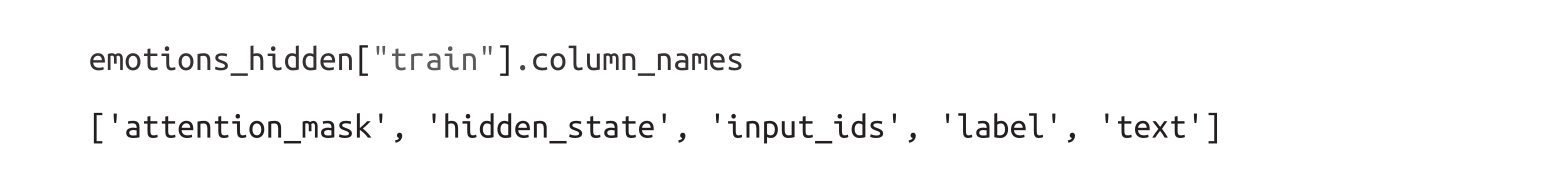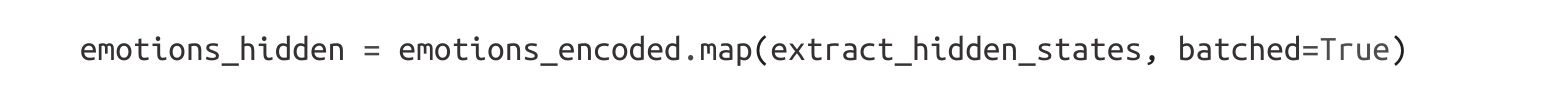 请注意,这里我们没有设置batch_size=None,这意味着使用了默认的batch_size=1000。正如预期的那样,应用extract_hidden_states()函数将一个新的hidden_state列添加到我们的数据集中。
