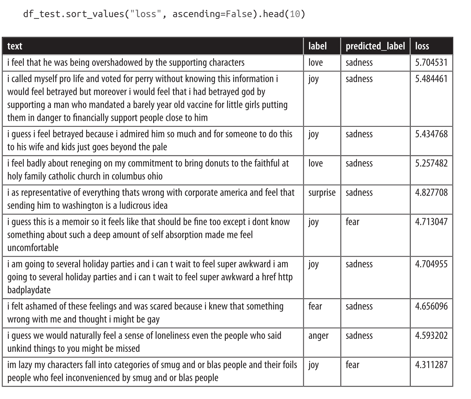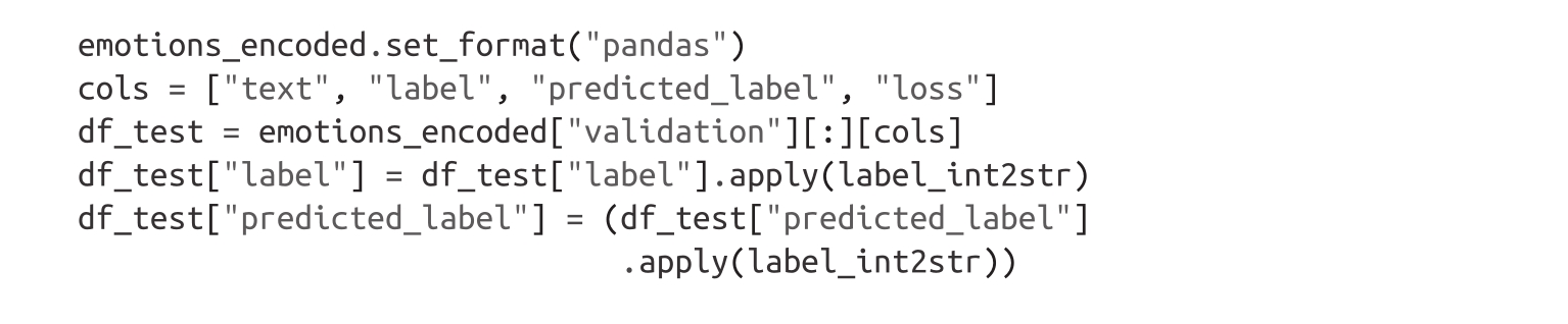 可见,与前面的基于特征的方法相比,微调方法的结果更接近于理想的对角线混淆矩阵。love类别仍然经常与joy混淆,这点逻辑上也讲得过去。surprise也经常被错误地识别为joy,或者与fear混淆。总体而言,模型的性能似乎非常不错,但在我们结束之前,让我们深入了解模型可能会犯的错误的类型。