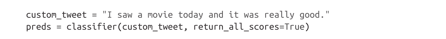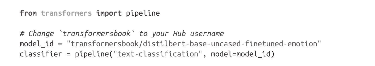 我们也可以使用微调模型来对新的推文进行预测。由于我们已将模型推到了Hub上,因此现在我们可以通过pipeline()函数来使用它,就像在第1章中所做的那样。首先,让我们加载pipeline: