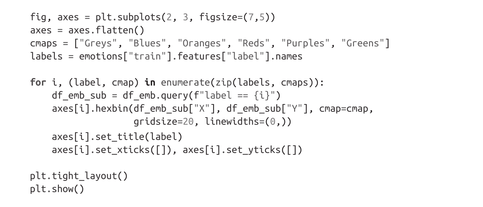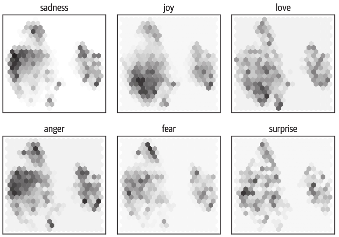 从这个图中,我们可以看到一些明显的模式:负面情感,如悲伤(sadness)、愤怒(anger)和恐惧(fear),都占据着类似的区域,但分布略有不同。另外,喜悦(joy)和爱情(love)与负面情感明显分开,并且也共享一个相似的空间。最后,惊奇(surprise)分散在整个图中。虽然我们可能希望有些区分,但这并不是肯定的,因为该模型并没有被训练去区分这些情感。它只是通过猜测文本中被掩码的单词来隐式地学习它们。