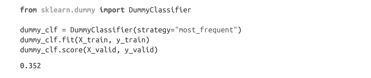 从准确率上看,我们的模型似乎只比随机模型稍微好一点,但由于我们处理的是一个不平衡的多分类数据集,它实际上会显著地表现更好。我们可以通过将其与简单基准进行比较来检查我们的模型是否良好。在Scikit-learn中,有一个DummyClassifier可以用于构建具有简单启发式的分类器,例如始终选择多数类或始终选择随机类。在这种情况下,表现最佳的启发式是始终选择最常见的类,这会产生约35%的准确率: