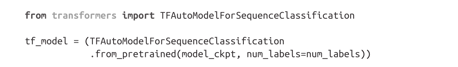 虽然本书中的代码大多用PyTorch编写,但Hugging Face Transformers库可以与TensorFlow和JAX紧密协作。这意味着你只需要改变一些代码即可在你最喜欢的深度学习框架中加载预训练模型!例如,我们可以使用TFAutoModel类在TensorFlow中加载DistilBERT: