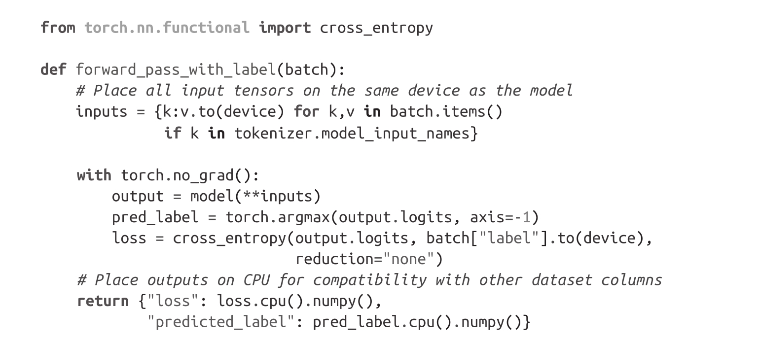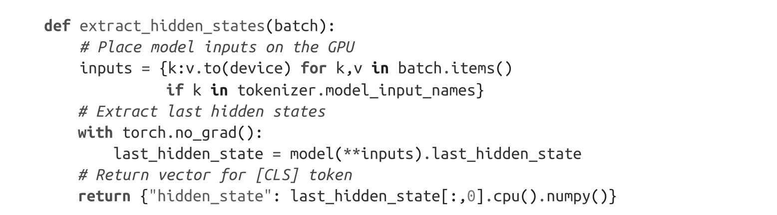 这个函数和我们之前的逻辑的唯一不同在于最后一步,即将最终的隐藏状态作为NumPy数组放回CPU。当我们使用批量输入时,map()方法要求处理函数返回Python或NumPy对象。