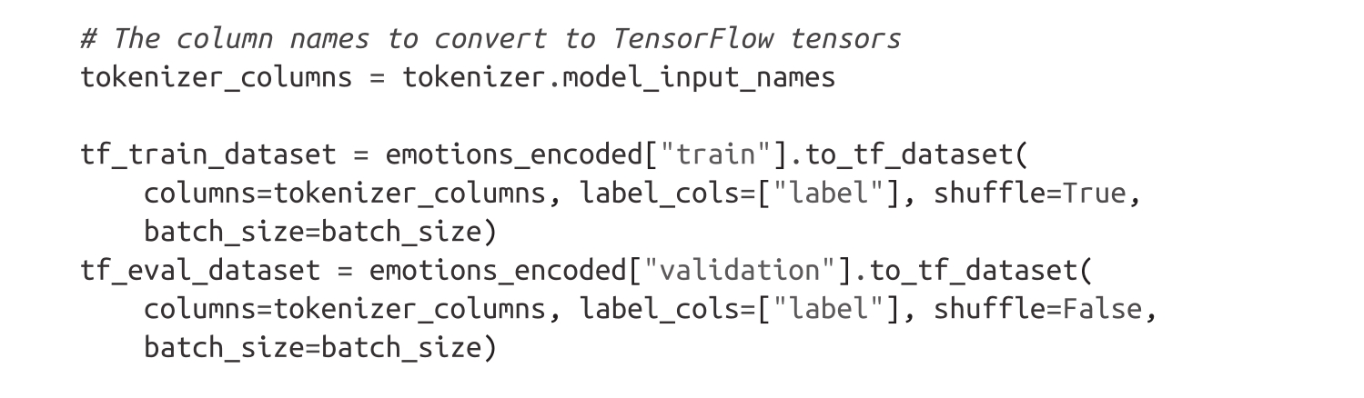 接下来,我们将把数据集转换为tf.data.Dataset格式。因为我们已经填充了词元化输入,所以我们可以通过将to_tf_dataset()方法应用于emotions_encoded轻松完成此转换: